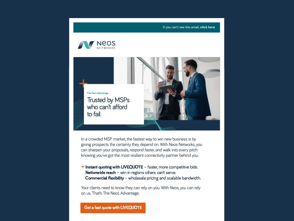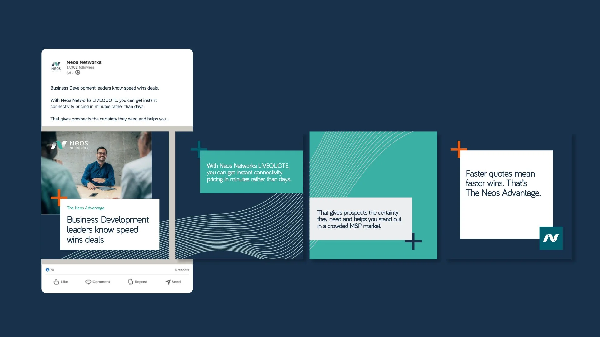 Targeting three MSP audience personas, the campaign employs proof-led storytelling, clear differentiators, and defined value to build awareness of Neos’ resilience, responsiveness, and flexibility - with the ultimate objective of generating MQLs for Neos.